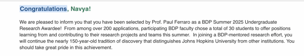 Working with mentors really changes the game. That’s why when I was looking for summer opportunities after my first year at Hopkins, I was particularly looking for programs and internships where I can learn from people who are the best in their field. In a session about research at Hopkins in my first week, I came to know about the Bloomberg Distinguished Professor Research Program (referred to as the BDP Summer Program from here on). A Bloomberg Distinguished Professor (or BDP) is a cohort of professors who work on ambitious interdisciplinary problems. The idea is that you get to work with a BDP for 10 weeks during the summer as a part of a paid fellowship. As soon as I heard of this program, I knew it would be the right fit for me.