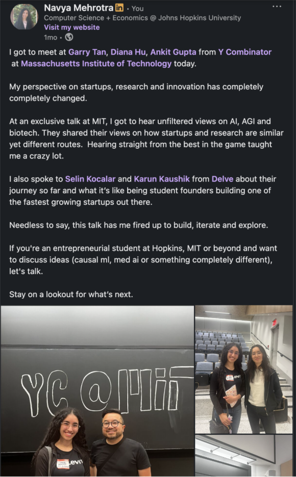It is totally possible (and encouraged!) to reach out to people yourself and set up chats with them. After attending an entrepreneurship event, I posted on LinkedIn about how I was interested in startups. Just from an eight-sentence post, I got multiple messages from Hopkins students to chat about possible projects and the startup culture here. At a place like Hopkins, you really are surrounded by the brightest peers, and there’s so much to learn from them too. From my coffee chats, I gained insight into what potential projects and collaborations I could start, as well as what is currently happening in the Hopkins startup landscape.