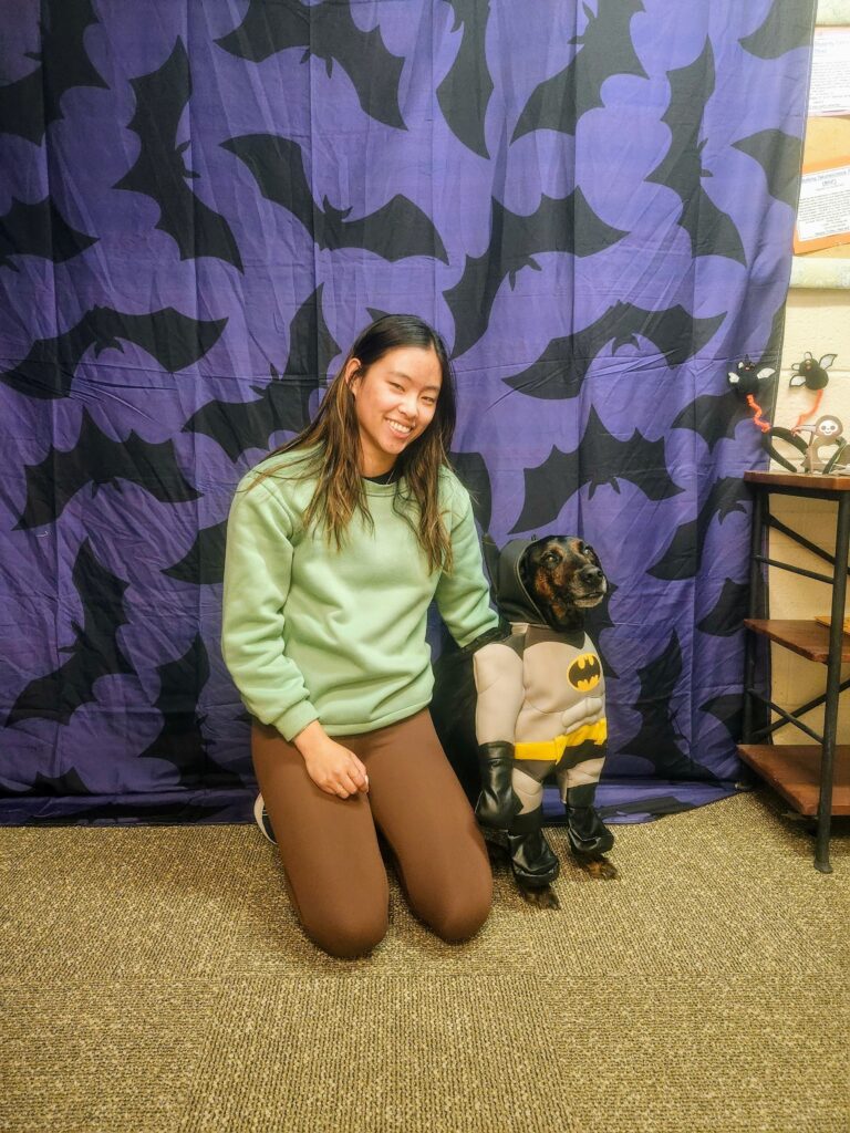 Not long after the self-care night, Halloween rolled around. Our department head, Dr. Bohn, adores Halloween and went all out for us. She decorated the hallway, had a photobooth set up, a conference room full of snacks and Halloween-themed trinkets, and even had fun facts about bats hidden around the building. Of course, she brought in her dog Doh and dressed up too. Although I was only able to stop by for 15 minutes, the event was ongoing for the whole day. Along with many other students, I was able to enjoy the Halloween festivities in the middle of a busy day and take a break from my regularly scheduled programming.